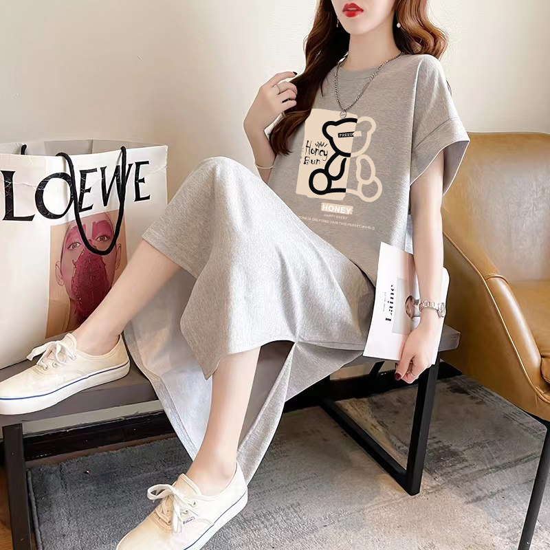 半小時前慵懒风短袖t恤裙女夏季休闲宽松过膝长裙纯棉长款连衣裙大码女装 - 灰色套裝